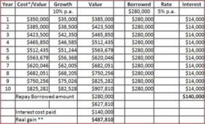 As a consequence of this factor, we can demonstrate that the gearing strategy is very successful. Assume the home loan has been raised at 5% per annum, and the value of the property grows at 10%. After ten years the property will be worth over $900,000. But, the borrower will only repay the original amount borrowed. Of course, they will have paid interest costs along the way!